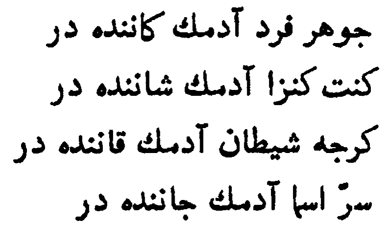 The beginning of the formula is also reproduced in Nasimi’s quatrain. It is important to note here that God expresses the will to be known (‘arif), which refers to the third level of Sufism — ma’rifah. God is the Truth. But this truth is deliberately apophatic (the neo-Platonic, super-existential, and unknowable Hen [ἓν]). In order to be known, Truth makes creation. But the act of knowing is the Logos, which means that the universe is the unfolded Logos. On this basis, the Hurufites identify the world with the sacred text. However, the world itself concentrates its Logos-essence into one pole — man. He is, in the end, the instance in which He who wants to be known is known. The Knower of that which is Unknowable but strives to be known, is extremely close to the object of knowledge. So, man himself becomes the Logos of the universe, penetrates into the essence of things and attains absolute power (the split moon). At the same time, the Logos is conceived by the Hurufite Nasimi as an ordered system of signs, that is, as a script, as scripture. The nature of man (Adam) encompasses everything precisely because man is nothing other than the Logos. Adam is a divine inscription that can read itself, and through this (i.e., everything else), can read the world. This reading of the world constitutes a knowledge of God attained through the “marifat“, that is, His cataphatic unfolding.
