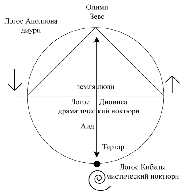 This mythological snapshot of the world can be interpreted in the most diverse ways. From a synchronic point of view, it is a map of three simultaneous regions of the world, each corresponding to the model of one of the three fundamental zones and three modes of the imagination. In this case, the Three Logoi represent three primordial positions of viewing the map of the Universe: from above (by Apollo and Olympus), from below (by Gaia, Cybele, and Tartarus), and from an intermediate position (that of Dionysus, Demeter, and humanity).